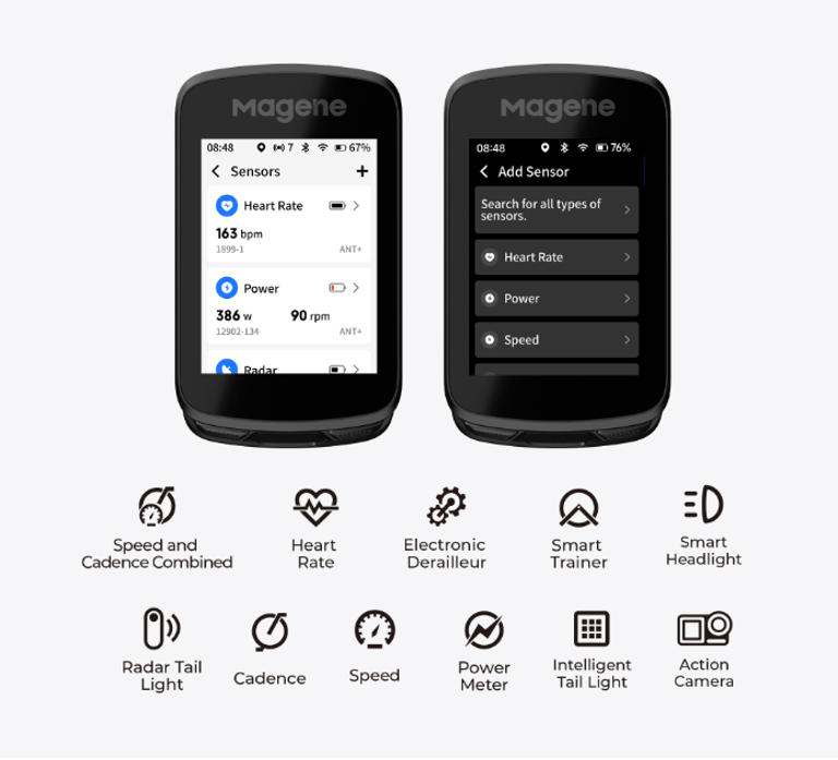 Gracias a los protocolos inalámbricos ANT+ y Bluetooth, puede conectarse a una amplia variedad de sensores y mostrar el nivel de batería y los datos en tiempo real en la página de sensores.